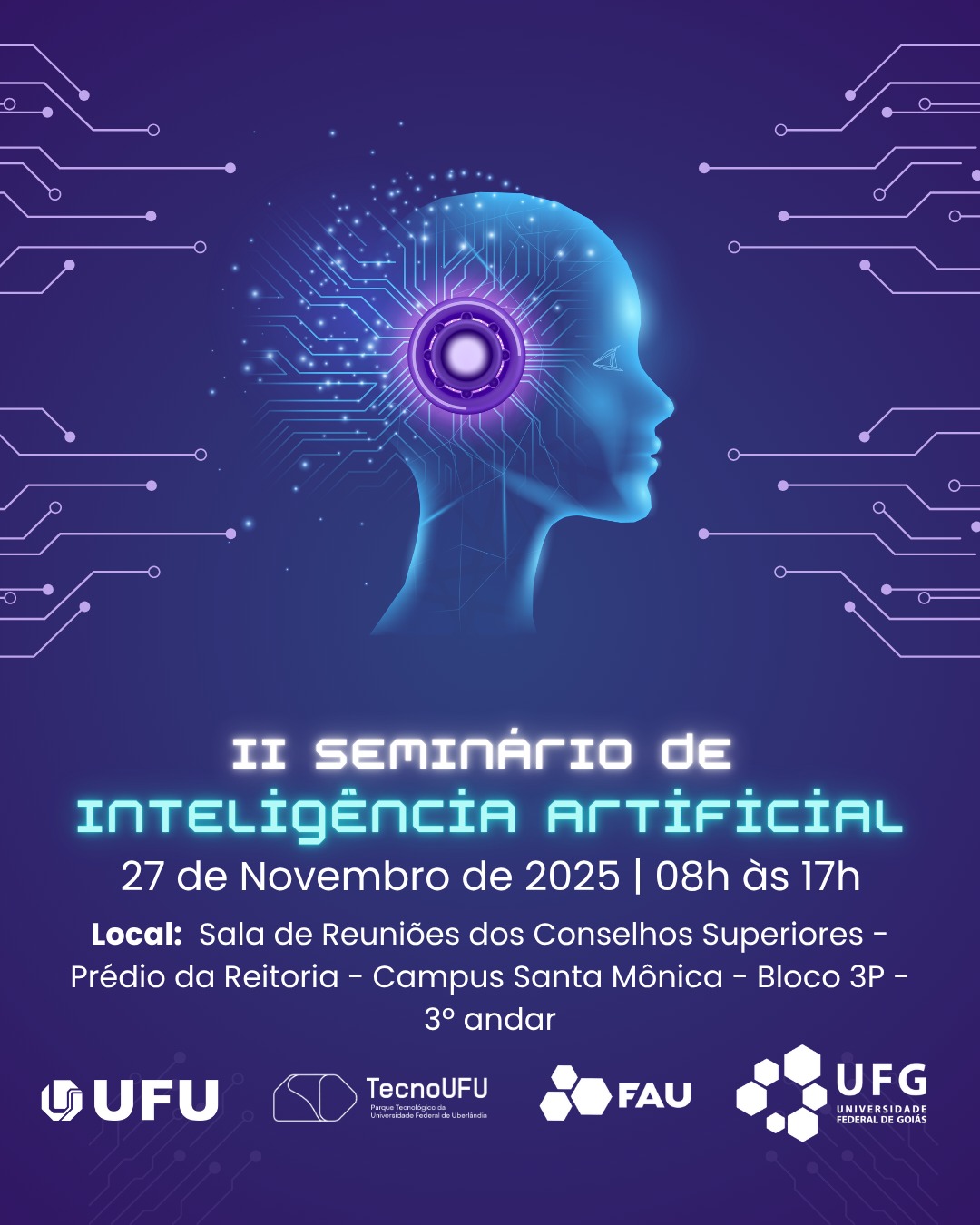Em 27/11, a UFU realiza o II Seminário de Inteligência Artificial — um dia de palestras, painéis e oficinas sobre aplicações de IA na educação, pesquisa, setor público e mercado, com enfoque em ética, privacidade e uso responsável.