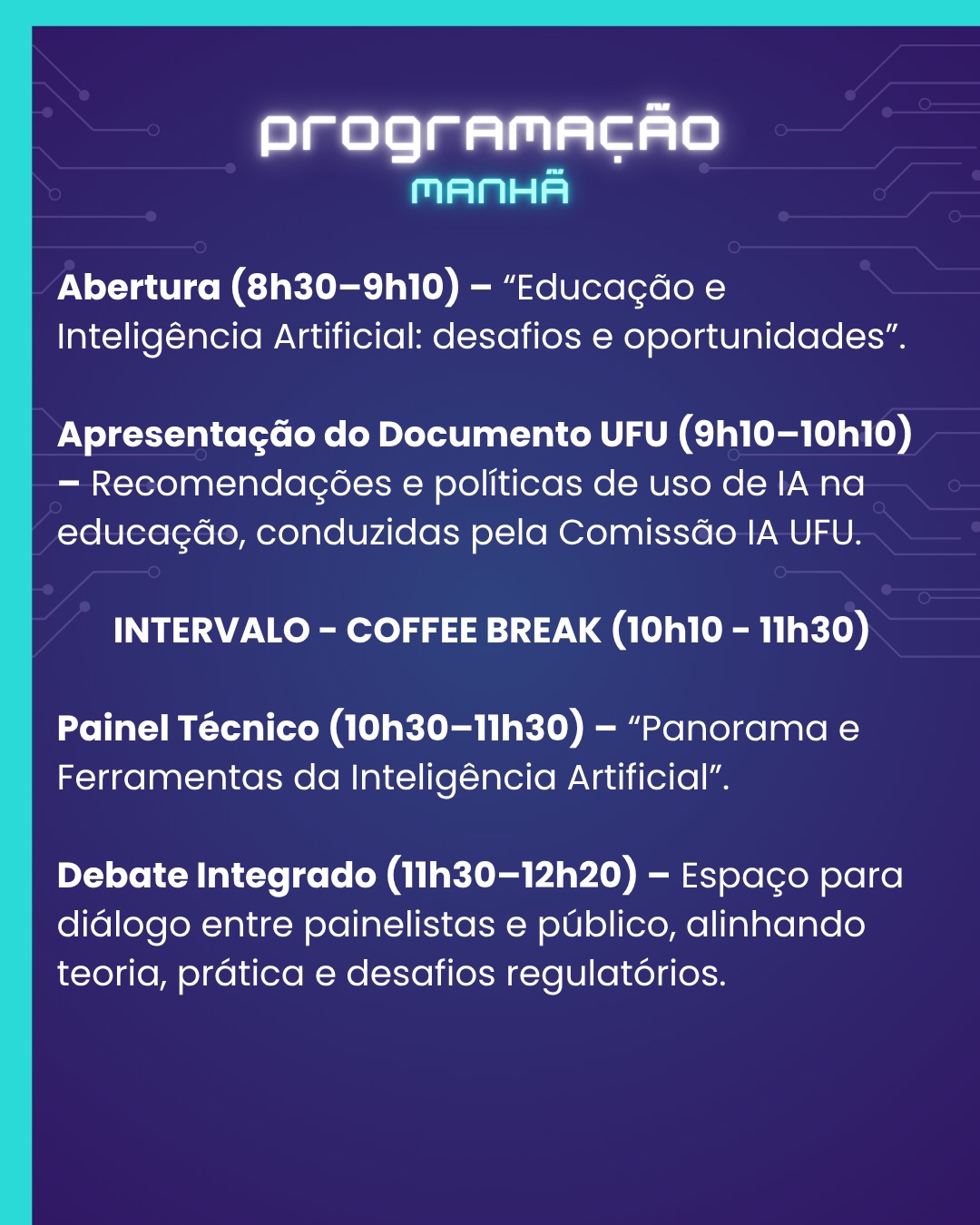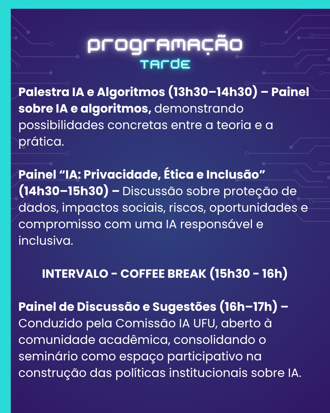 O seminário conclui com um painel aberto coordenado pela Comissão de IA da UFU, no qual membros da comunidade acadêmica podem apresentar sugestões, compartilhar preocupações e contribuir para a construção de um roadmap institucional para a integração responsável de inteligência artificial na Universidade.